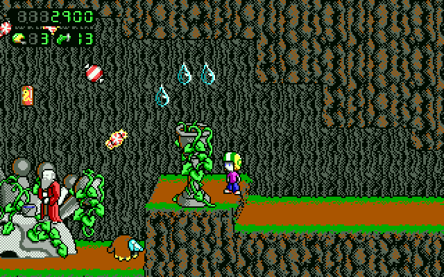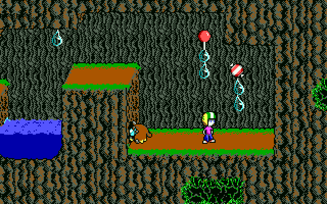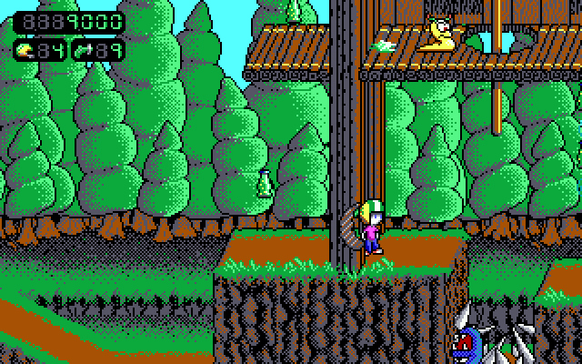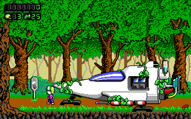 Commander Keen investigates a forest planet after receiving a call for help from the natives. You run, jump and use your pogo stick to explore the levels, and defend yourself against hostile creatures using Keen's Neural Stunner. New features include mid-level checkpoints, save/load system, ammo refill machines and unlockable goodies that can be found in the Bean & Bacon Megarocket. The default art style is similar to, but not identical to that of the original Keen games, with the main character looking slightly different.