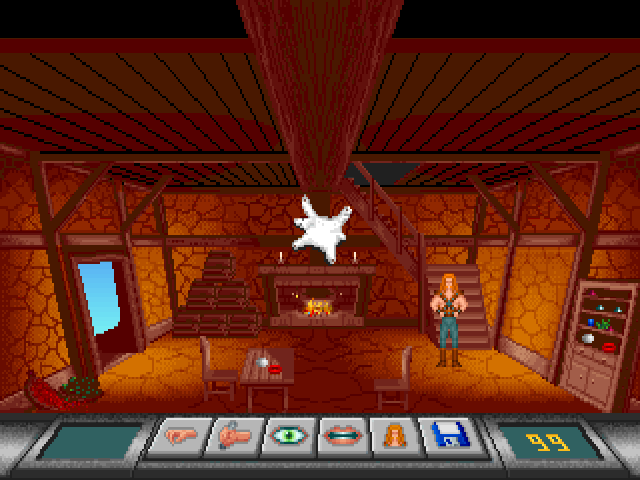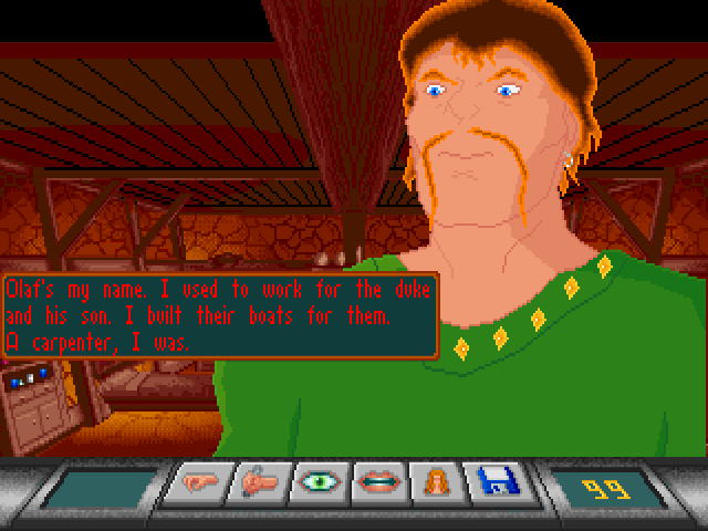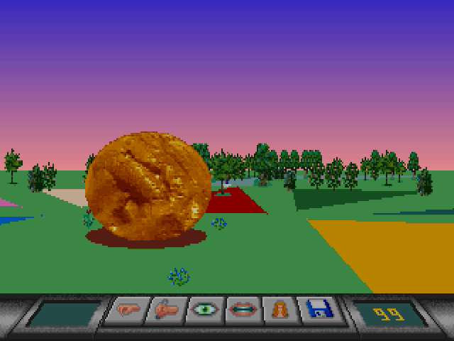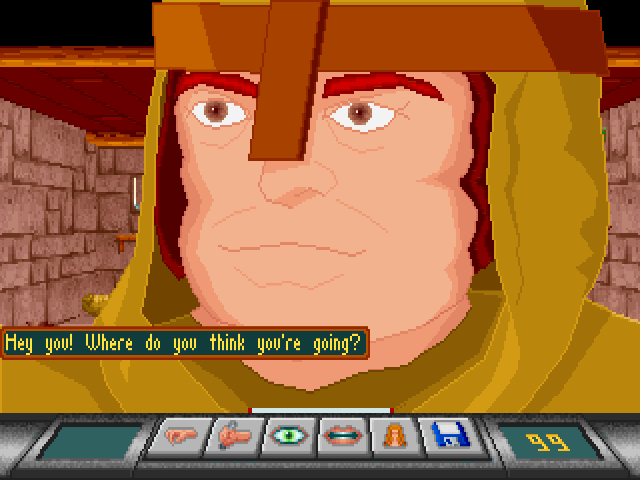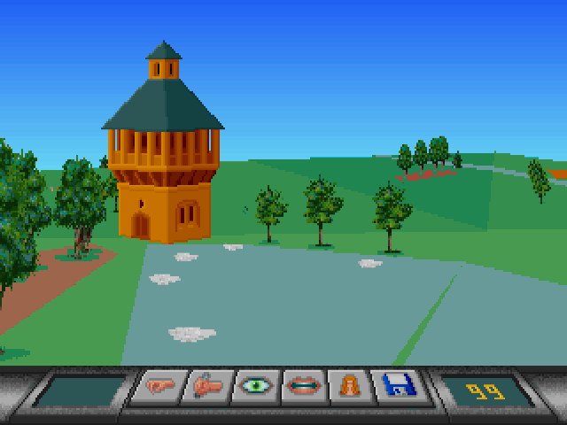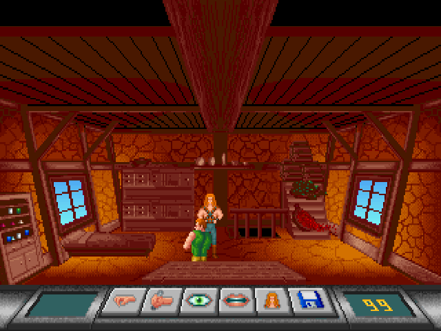 Eternam is an odd beast of an adventure game. It combines classic pixel-art side-view scenes for indoor environments with early 3D first-person exploration similar to old flight sims for outdoors. Character close-ups and certain cut-scenes seem to come straight out of a Saturday morning cartoon, but the player's only trusted side character is a digitized live actor.