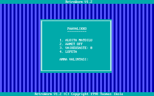 RetroWorm is a simple Nibbles variant with text-mode graphics. The main difference from the classic Nibbles is that each time you play, there are random obstacles (blue dots) scattered across the playing field. The objectives is always to collect ten "food" items that look like diamonds. You can adjust difficulty by selecting one of three speed settings, but that's about it. There is no high score table or anything of the kind.
